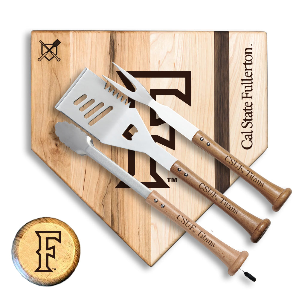 - Includes: "Slider" Spatula, "Forkball" Fork, "Splitfinger" Tongs, and "Home Plate" Cutting Board.