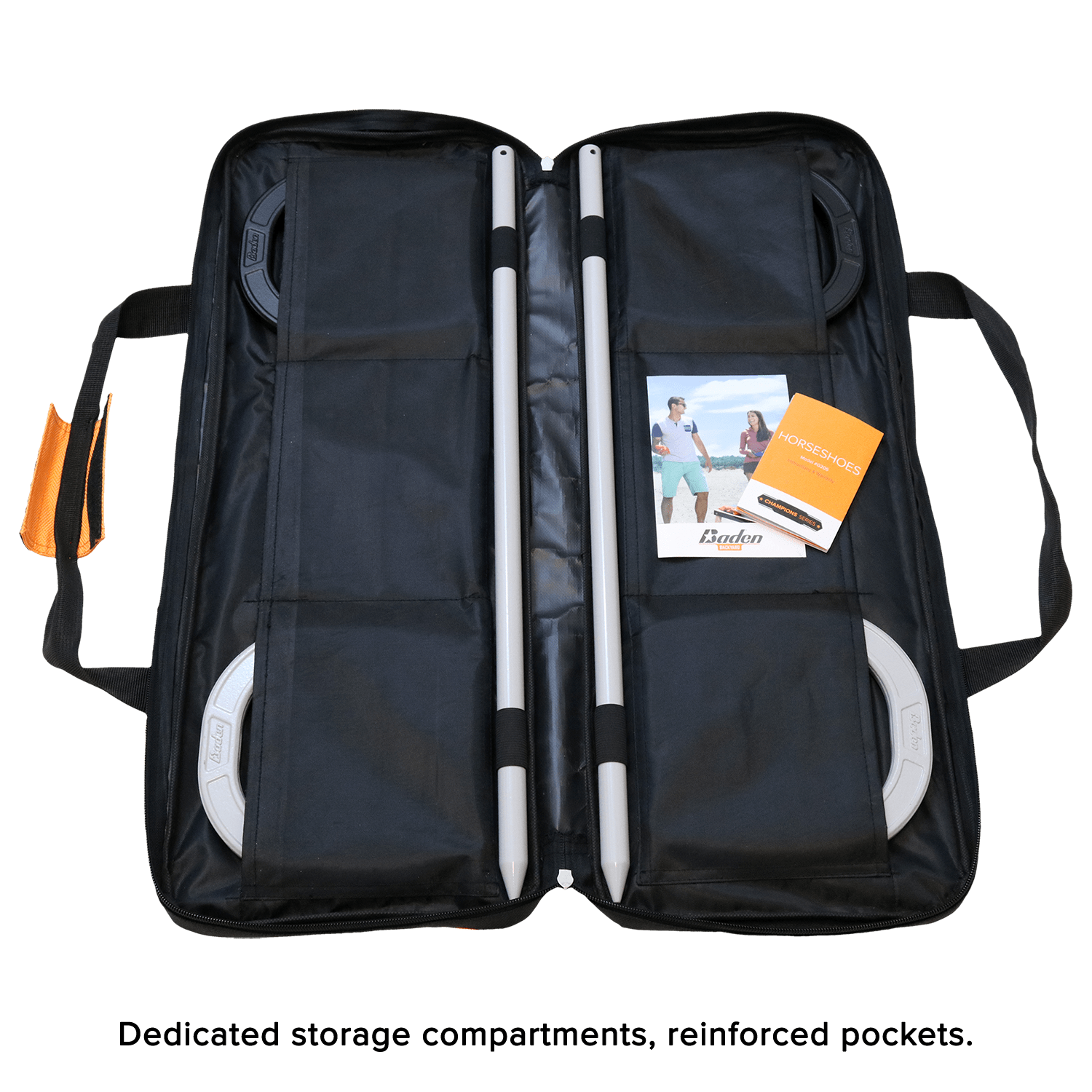 - Set comes in 1680 denier durable nylon bag with reinforced pockets, dedicated storage compartments for horseshoes and stakes, and velcro handle for easy carrying.