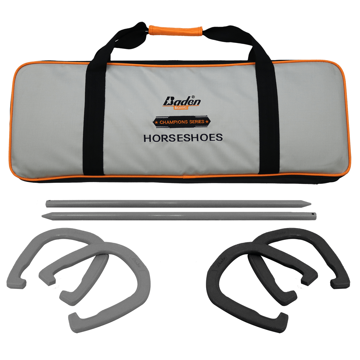 - Conveniently store (2) black forged steel horseshoes, (2) grey forged steel horseshoes and (2) 24” steel stakes in (1) 1680 denier durable nylon bag with reinforced pockets and velcro handle. Rules and instructions are included.