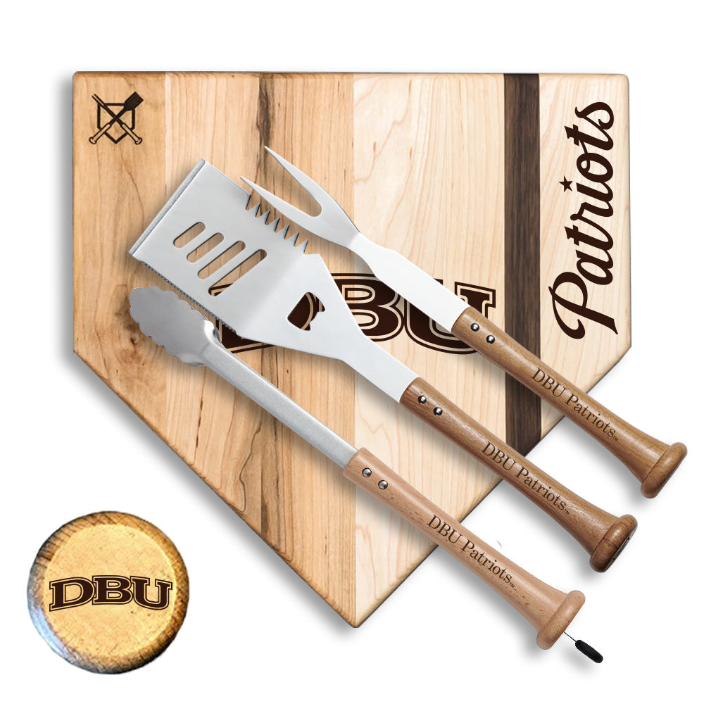 - Includes: "Slider" Spatula, "Forkball" Fork, "Splitfinger" Tongs, and "Home Plate" Cutting Board.