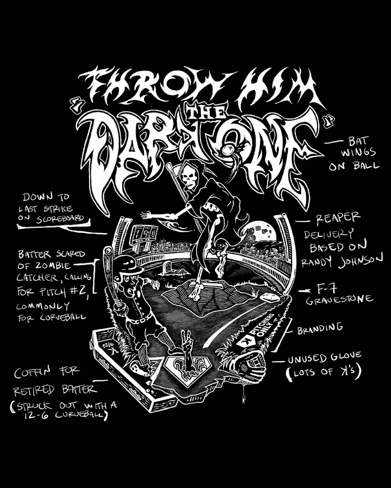 The Dark One Hoodie features bold artwork by former pitcher John Timmins. Part of the Pitchers Only 2025 Halloween Collection.