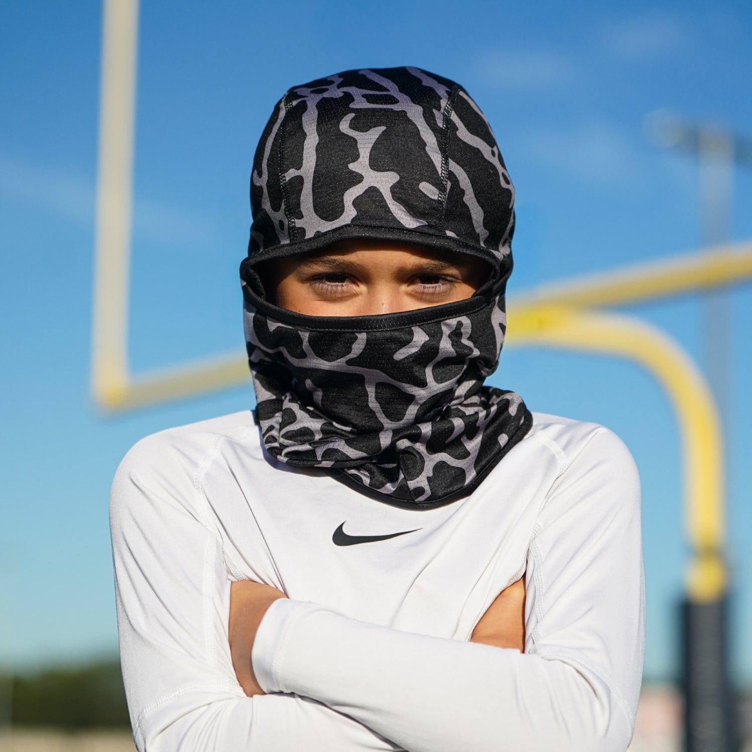 The Balaclava Mask keeps you cool and dry in the sun, warm in cold weather, and shielded from wind, turf burn, and UV rays.