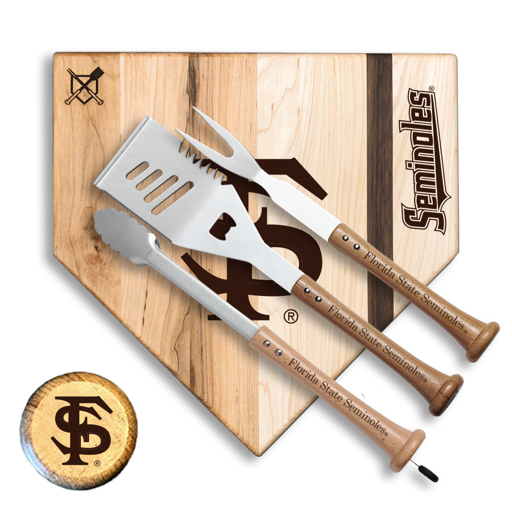 - Includes: "Slider" Spatula, "Forkball" Fork, "Splitfinger" Tongs, and "Home Plate" Cutting Board.