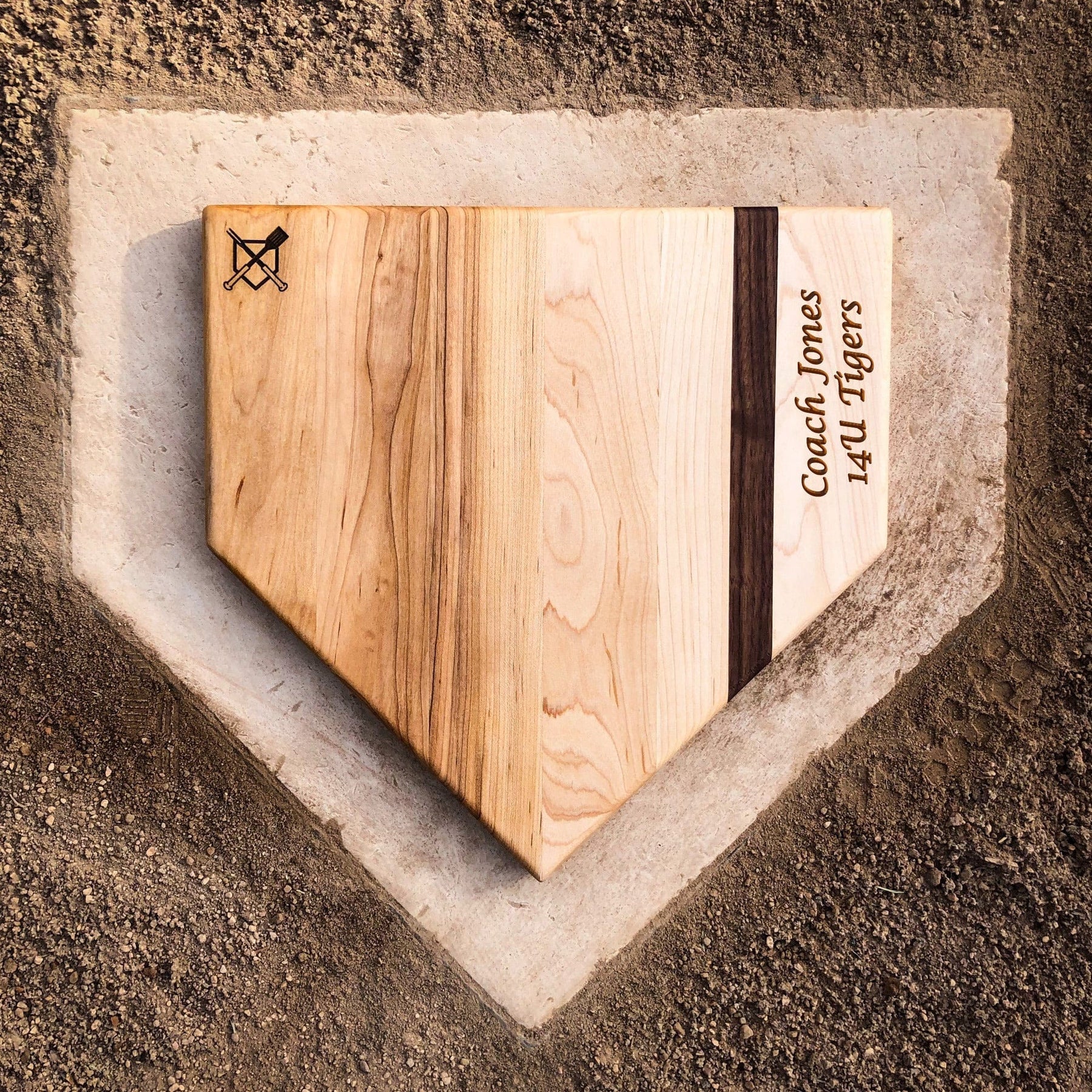 Looking to add a personal touch to the ultimate baseball fan's cutting board? We now offer customization on our (12"x12") Home Plate Cutting Board with laser-engraved text. Add your personalized message to the solid Western Maple and Black Walnut cutting board in the iconic Home Plate shape to make the perfect gift for birthdays, housewarmings, weddings, holidays, baseball fans, BBQ grill masters/mavens and more.