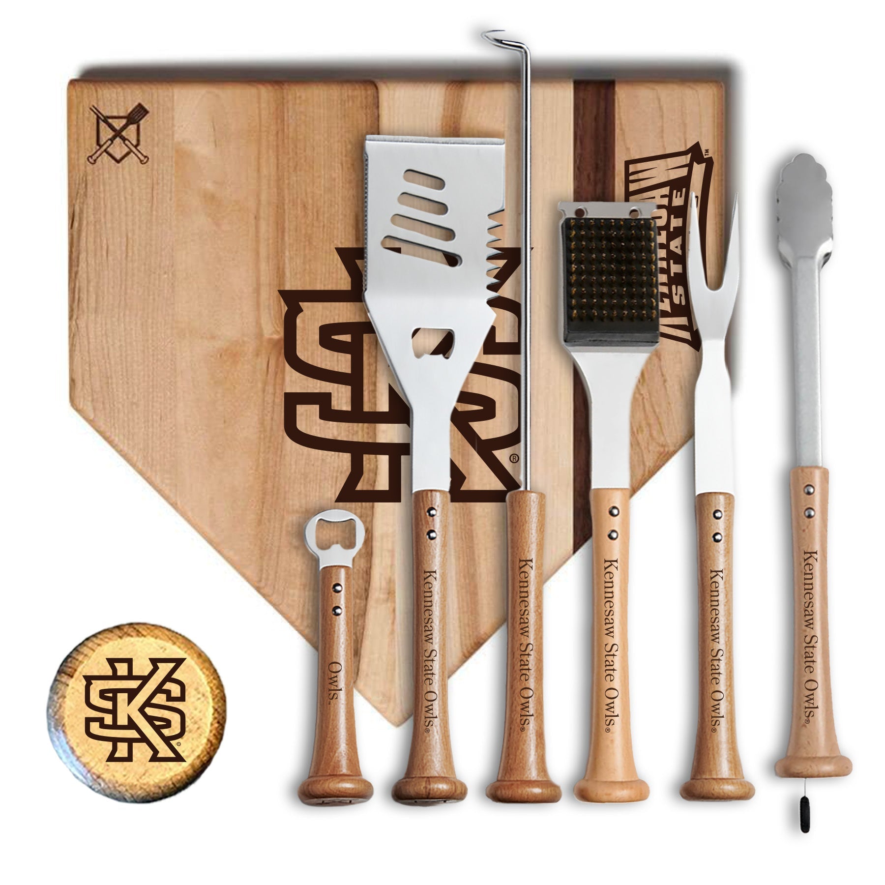 - Includes: "Slider" Spatula, "Forkball" Fork, "Pickoff" Bottle Opener, "Splitfinger" Tongs, "Brushback" Scraper, "The Hook" Pigtail and Home Plate cutting board.
