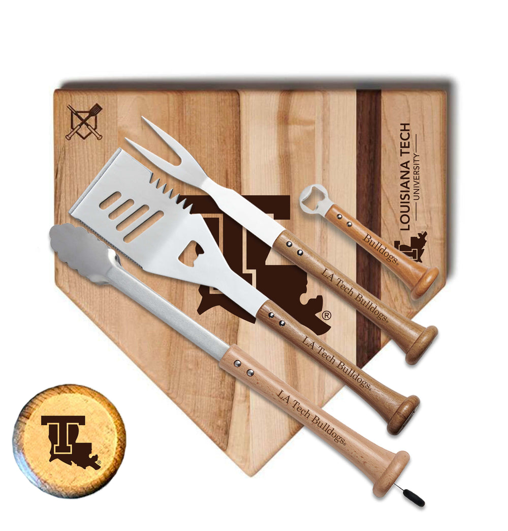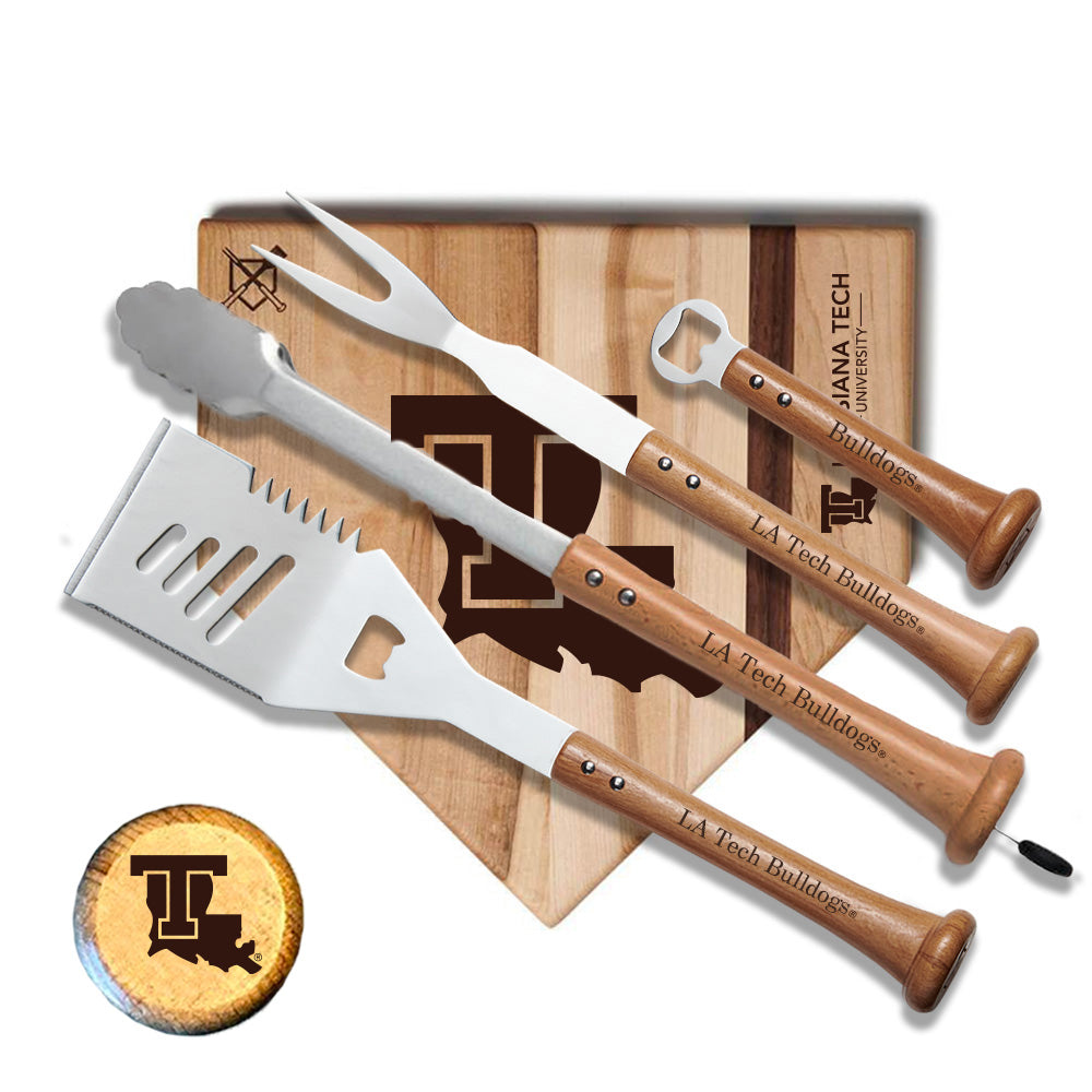 - Includes: "Slider" Spatula, "Forkball" Fork, "Pickoff" Bottle Opener, "Splitfinger" Tongs, and "Home Plate" Cutting Board
