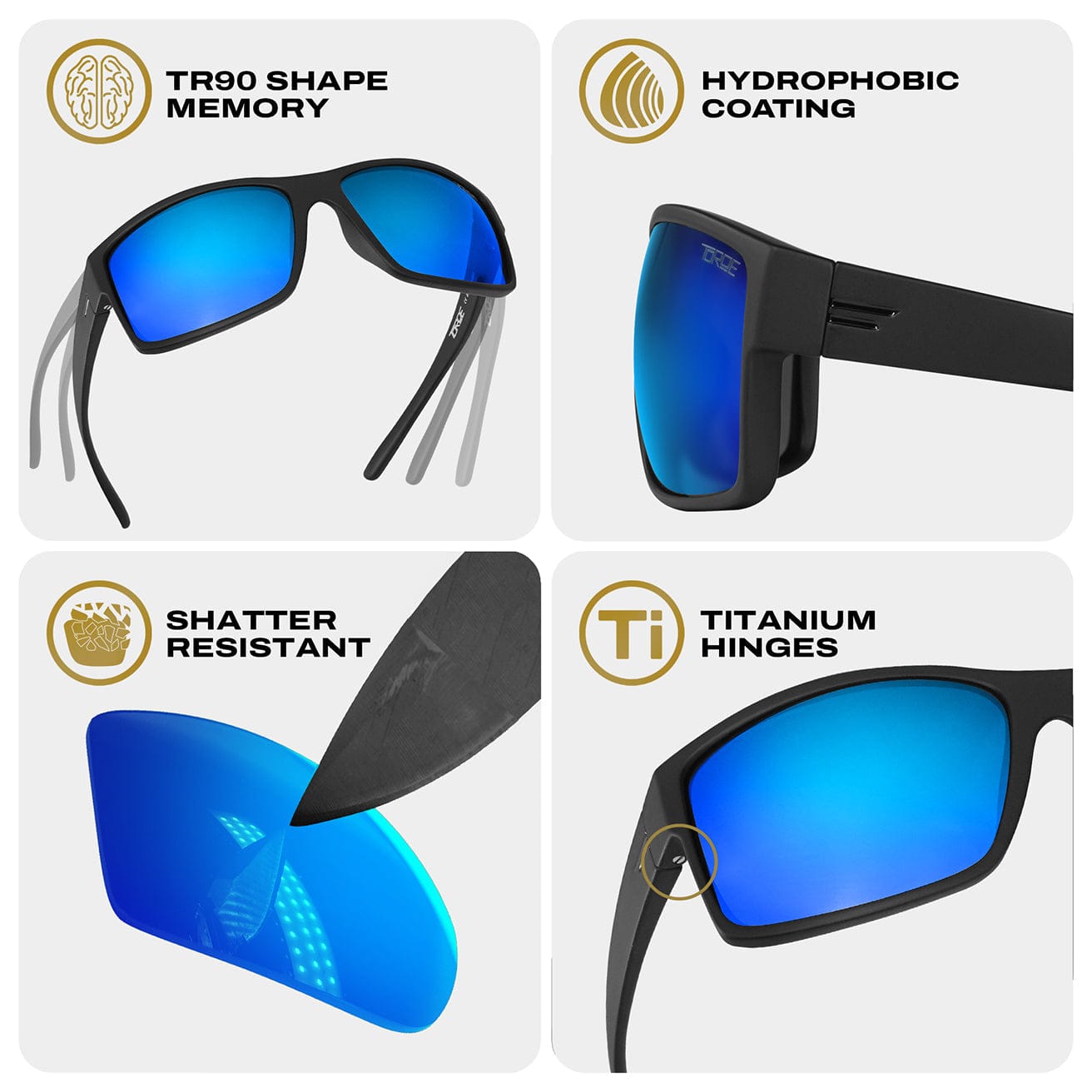 Beyond fishing, the Mojave Blue lenses excel in high-performance sports and intense outdoor activity where glare, brightness, and visual fatigue limit performance. The premium polarized optics sharpen detail, improve depth perception, and reduce harsh reflections from pavement, sand, and open terrain, making them ideal for training, trail work, endurance sports, and fast-paced outdoor movement. Shatter-resistant, scratch-resistant lenses pair with a durable TR90 flex frame and reinforced titanium hinges for lightweight strength and stability. Finished in a sport-light matte black soft-touch frame and backed by TOROE’s lifetime warranty, the Mojave Blue has remained a go-to performance sunglass for serious fishermen and outdoor athletes alike for years.