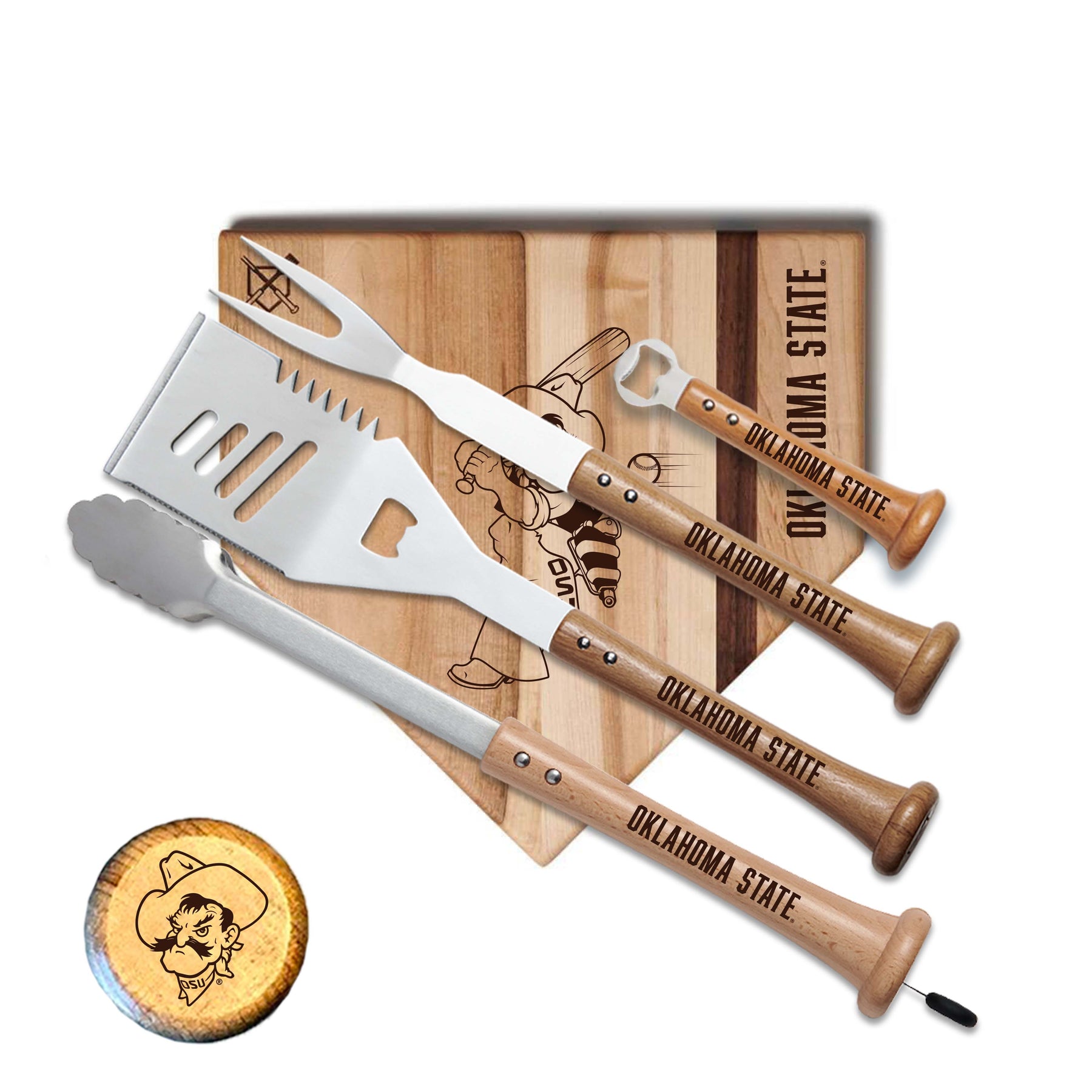 - Includes: "Slider" Spatula, "Forkball" Fork, "Pickoff" Bottle Opener, "Splitfinger" Tongs, and "Home Plate" Cutting Board