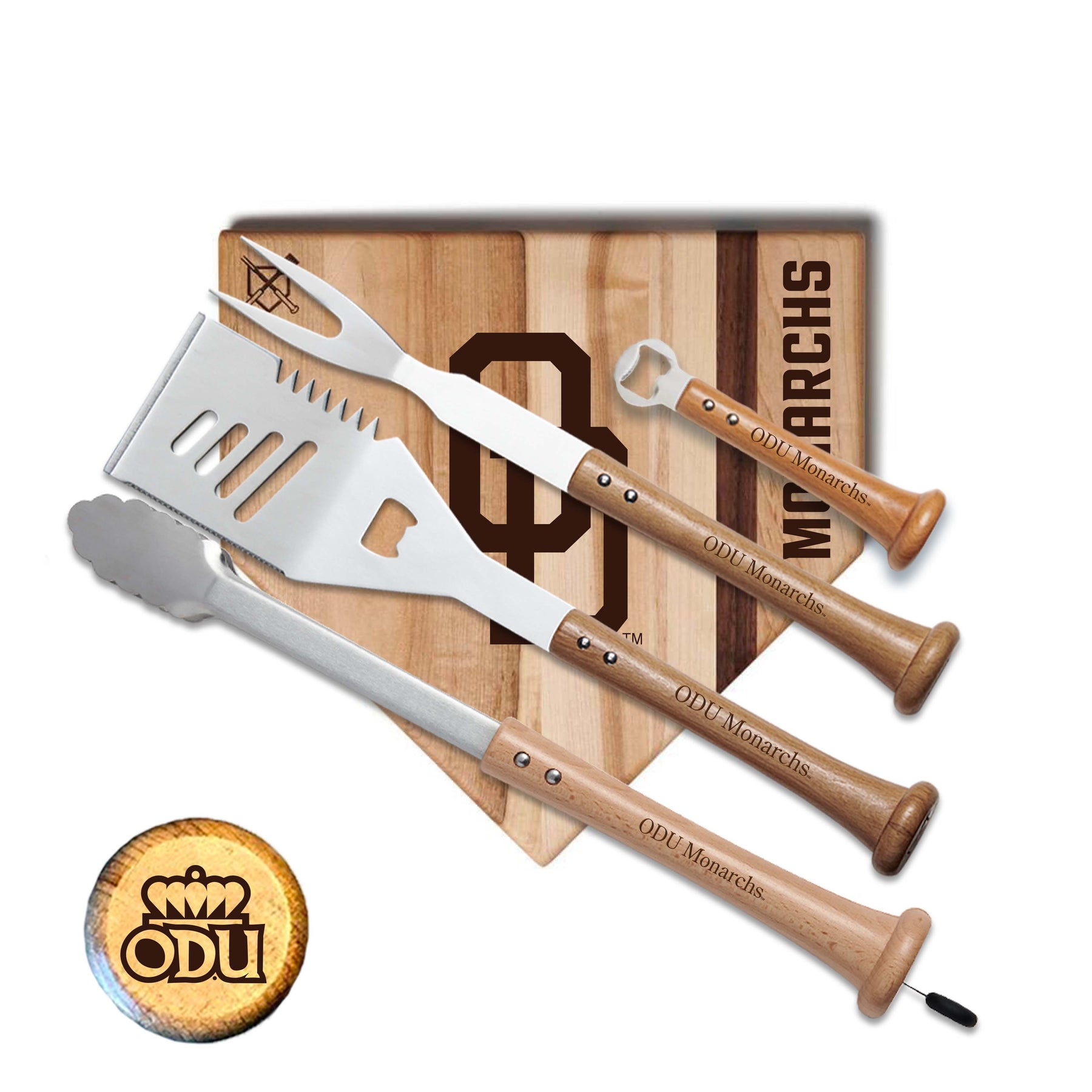 - Includes: "Slider" Spatula, "Forkball" Fork, "Pickoff" Bottle Opener, "Splitfinger" Tongs, and "Home Plate" Cutting Board