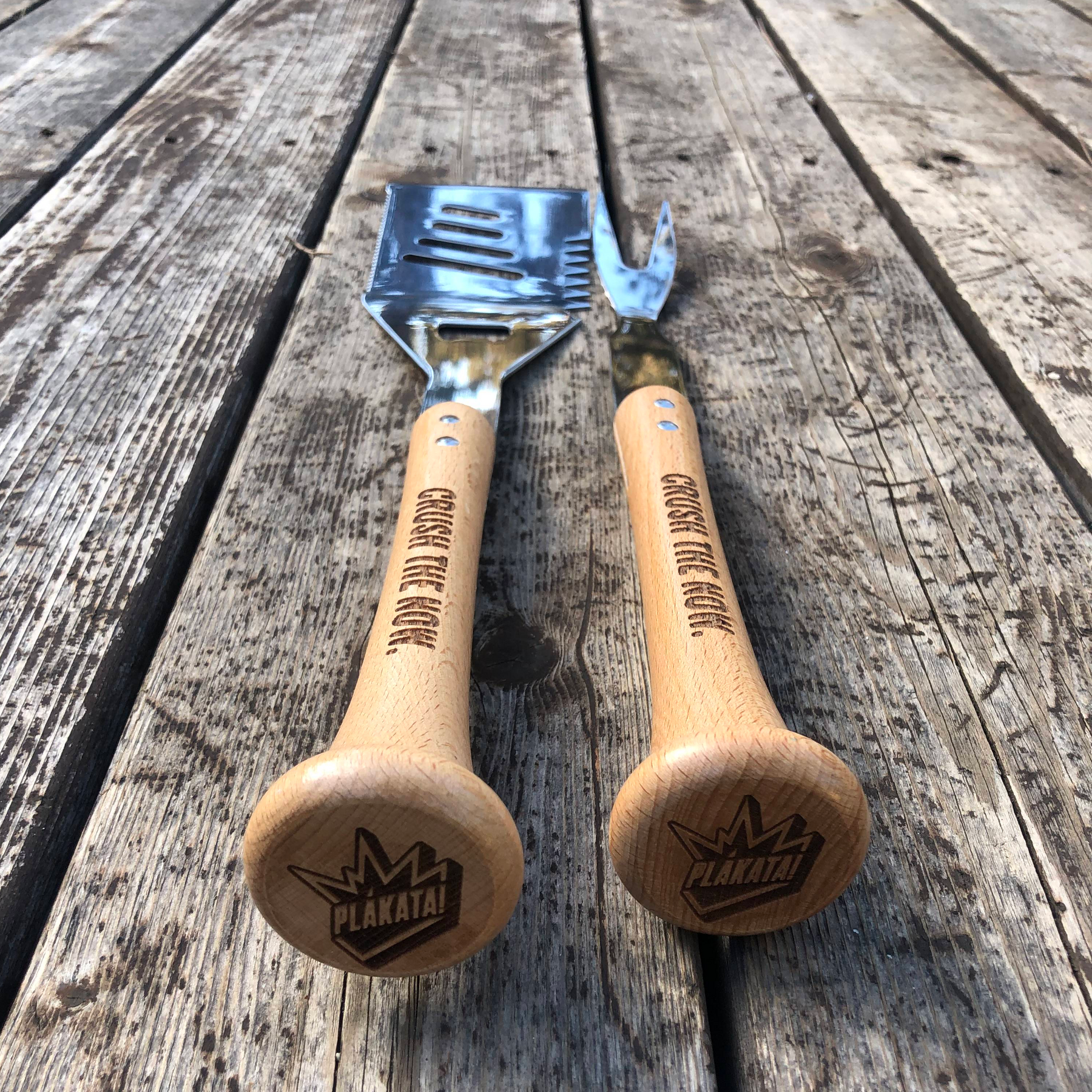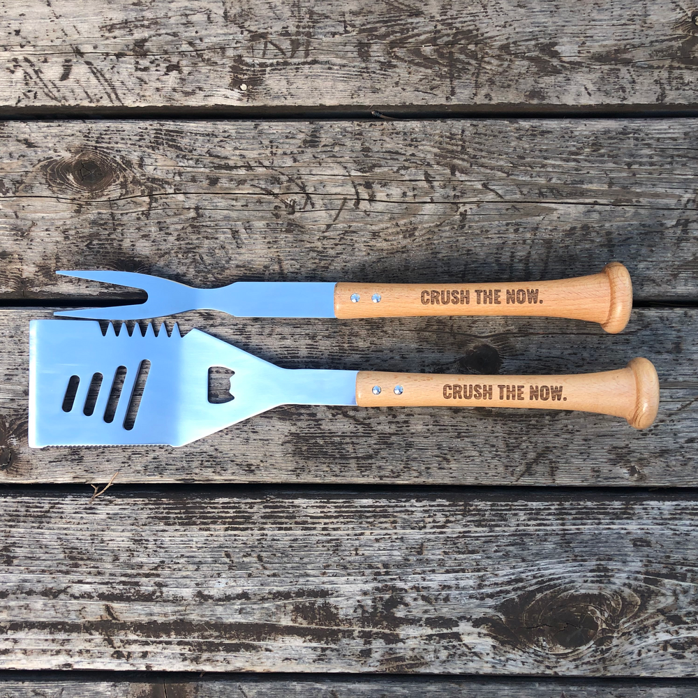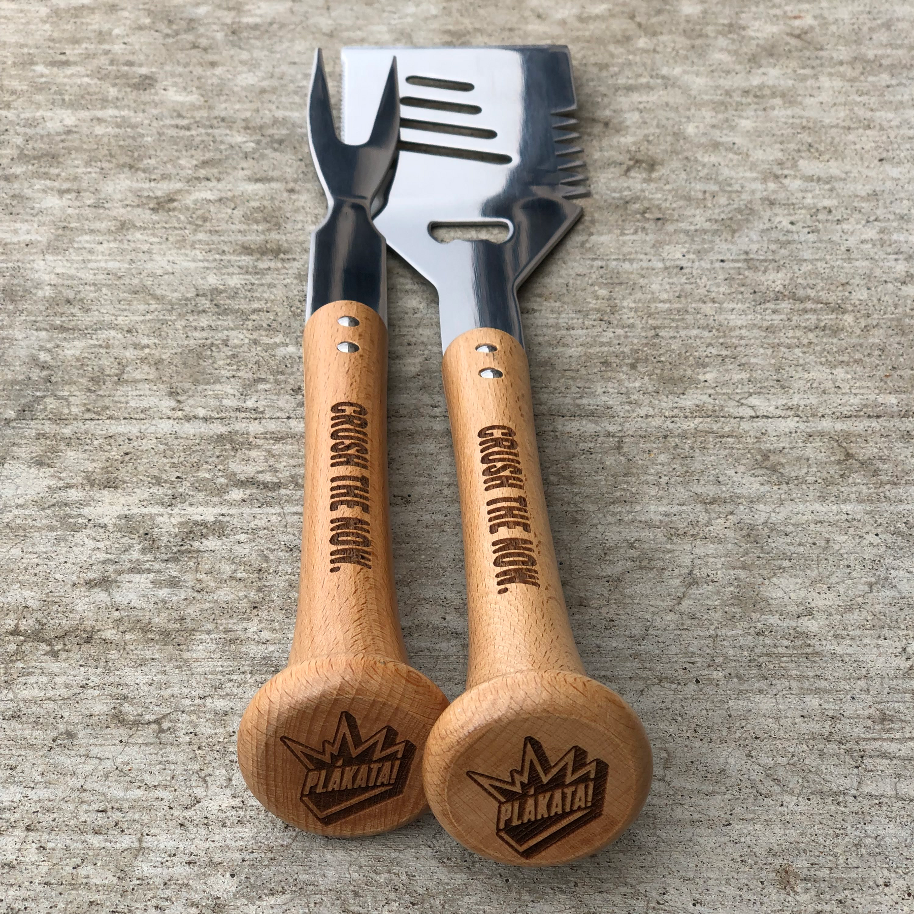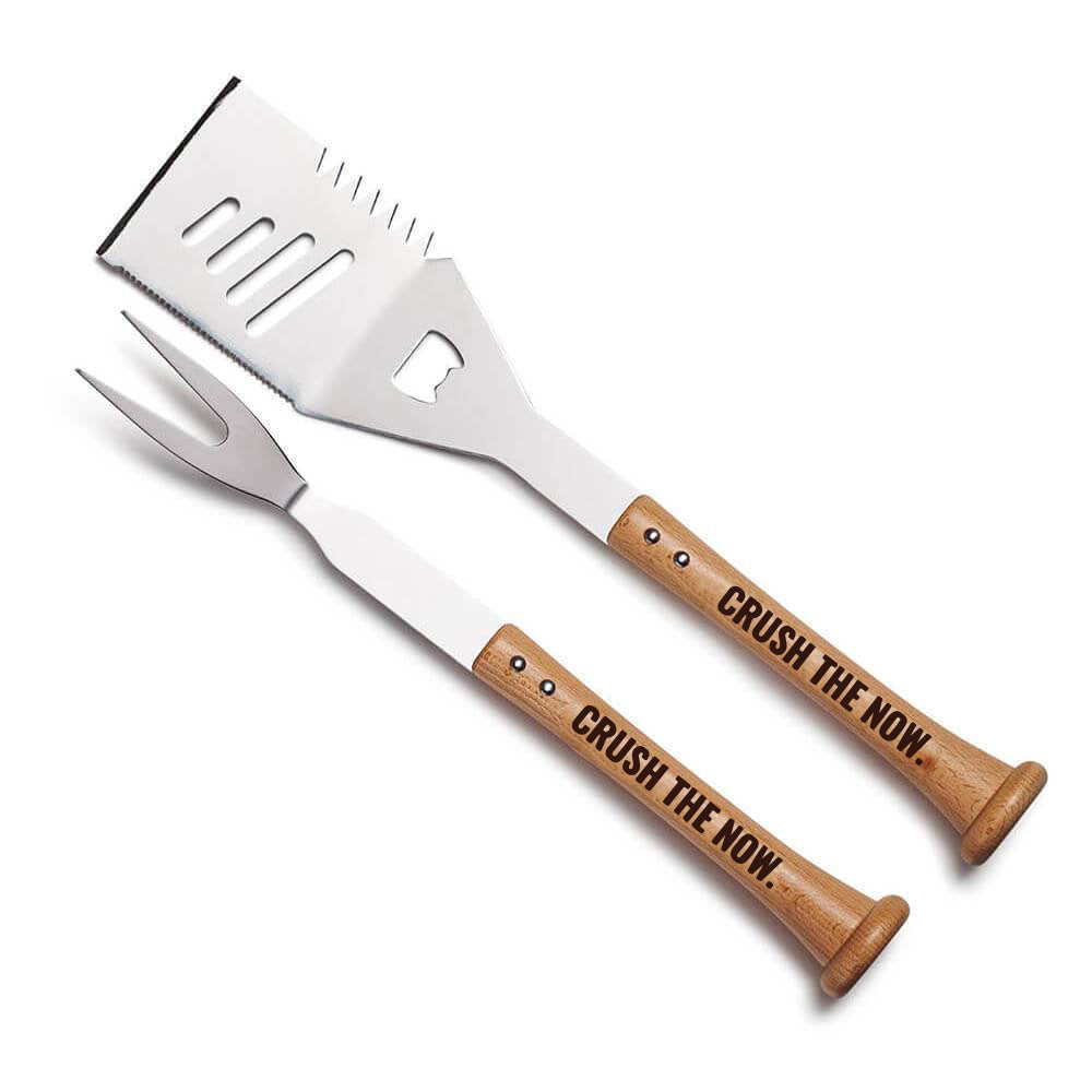 The Baseball BBQ Turn Two Combo Set provides baseball fans a performance grill tools set with the familiar feel of a well-made wooden bat. The Turn Two Combo Set includes our Slider Spatula and the Forkball Fork, whose patented bat handle design uses well-crafted, all-natural hardwood for big-league feel and performance. Replicating the dimensions of an actual bat, the handles of the Turn Two Combo Set are riveted to professional grade stainless steel to flip, tenderize, cut, and scrape anything you can throw at the grill, as well as pop the top off a cold beer. With more features than a five-tool ballplayer, the Turn Two Combo Set will make every BBQ play as easy as 6-4-3.