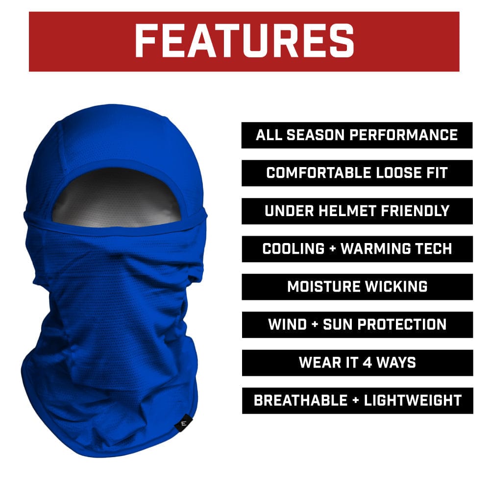 The Balaclava Mask keeps you cool and dry in the sun, warm in cold weather, and shielded from wind, turf burn, and UV rays.