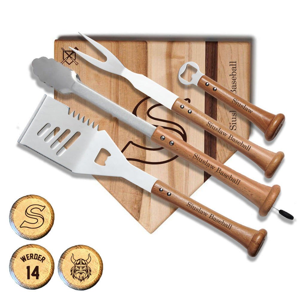 - Includes: "Slider" Spatula, "Forkball" Fork, "Pickoff" Bottle Opener, "Splitfinger" Tongs, and "Home Plate" Cutting Board