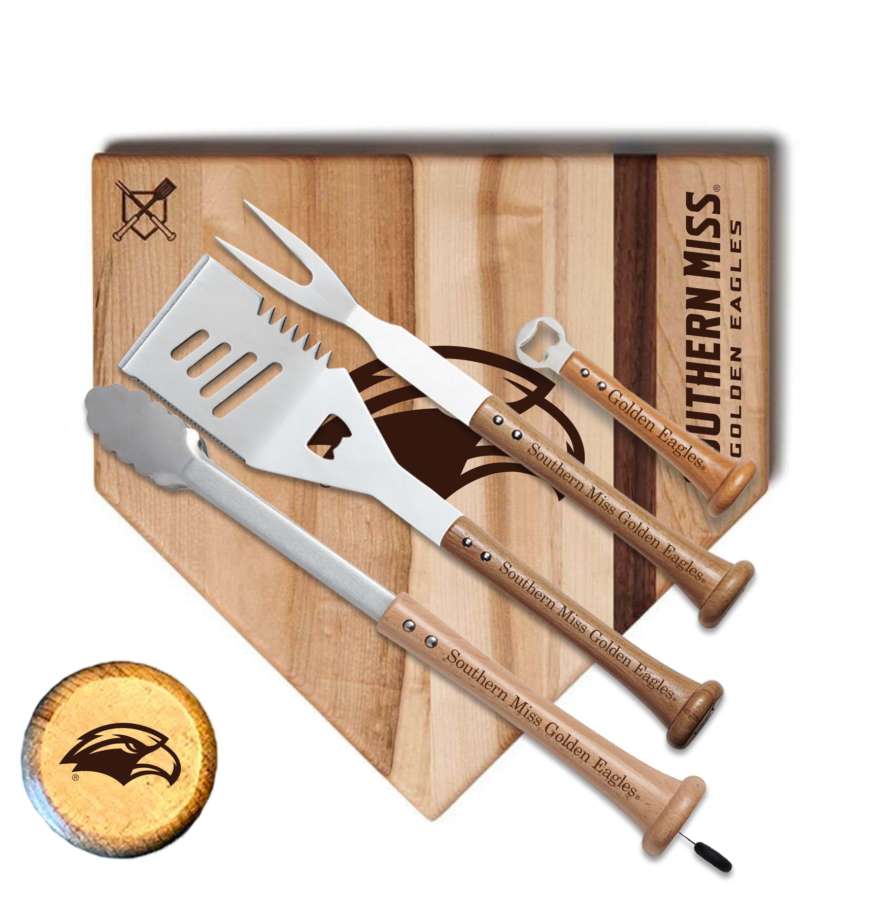 - Includes: "Slider" Spatula, "Forkball" Fork, "Pickoff" Bottle Opener, "Splitfinger" Tongs, and "Home Plate" Cutting Board