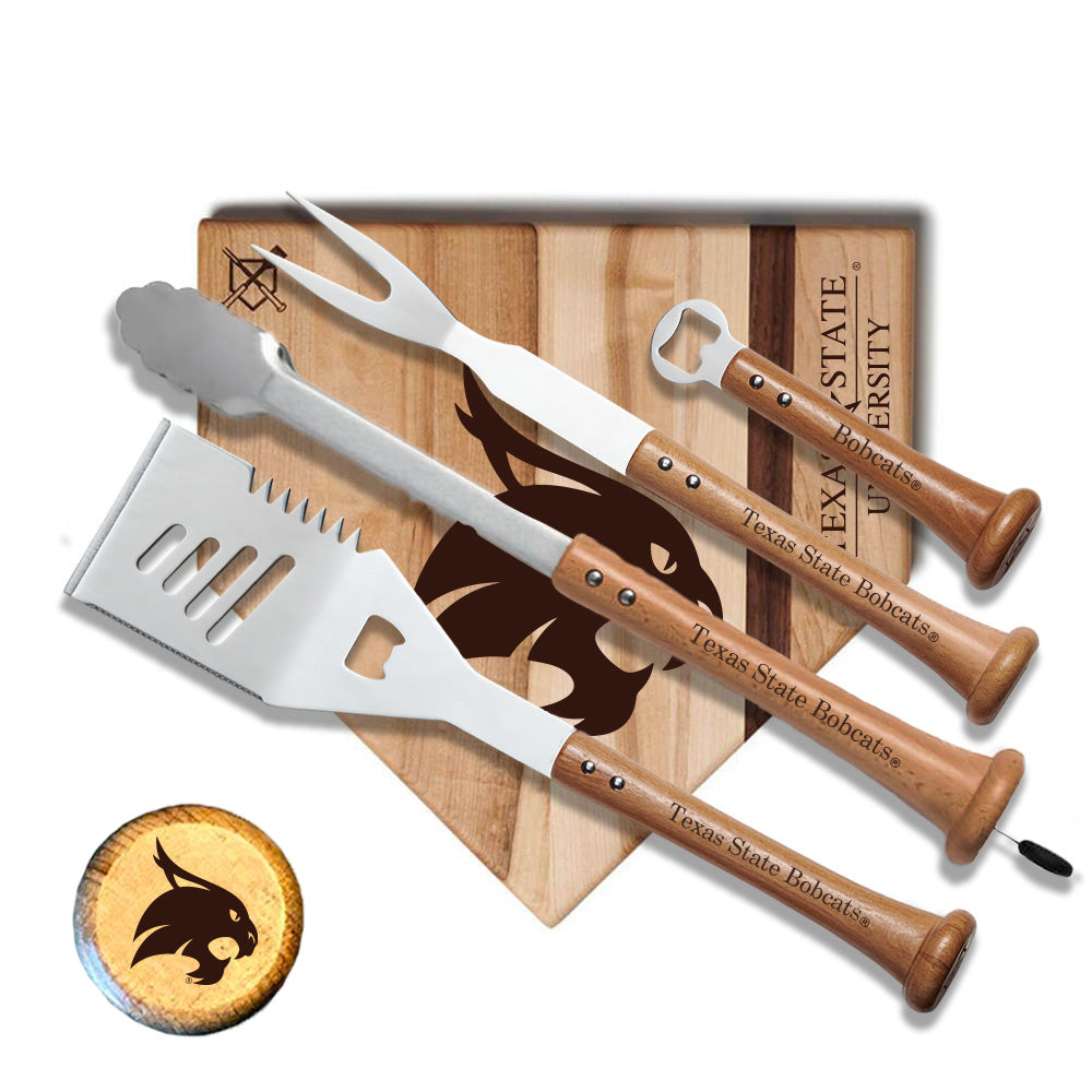 - Includes: "Slider" Spatula, "Forkball" Fork, "Pickoff" Bottle Opener, "Splitfinger" Tongs, and "Home Plate" Cutting Board