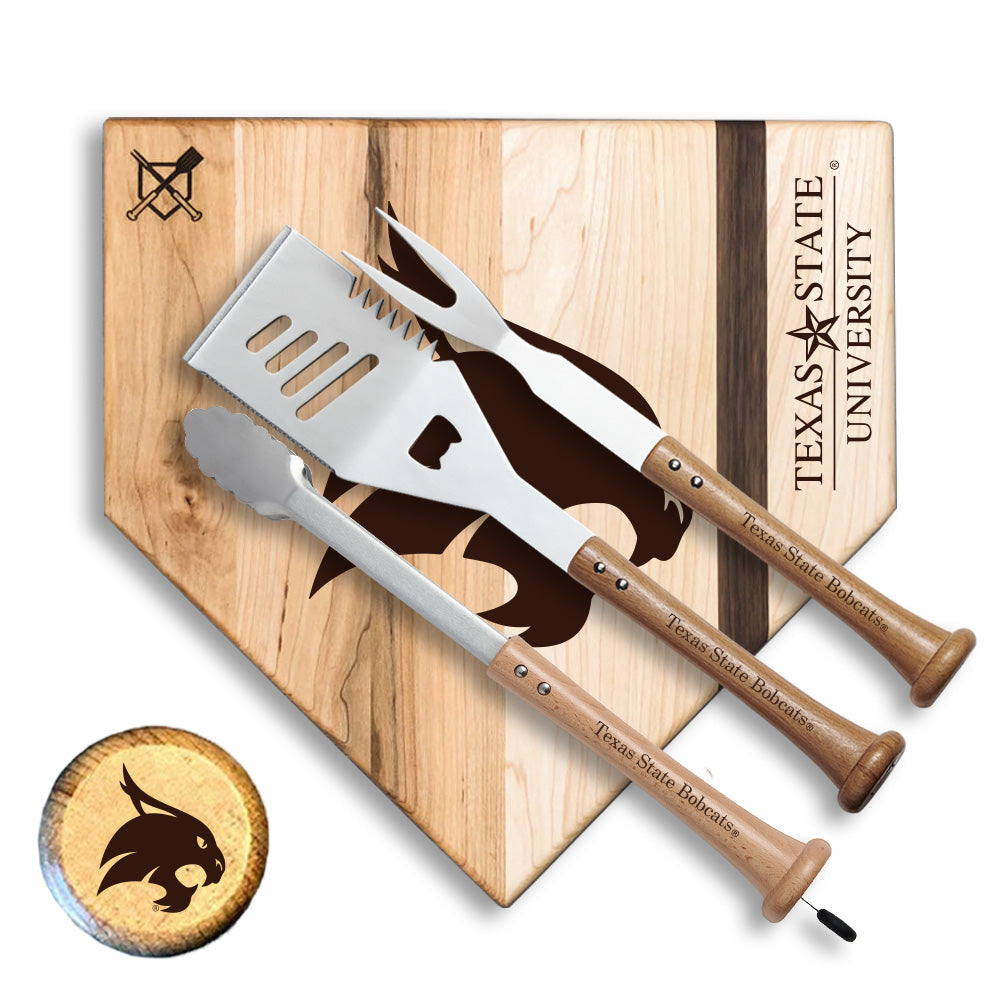 - Includes: "Slider" Spatula, "Forkball" Fork, "Splitfinger" Tongs, and "Home Plate" Cutting Board.